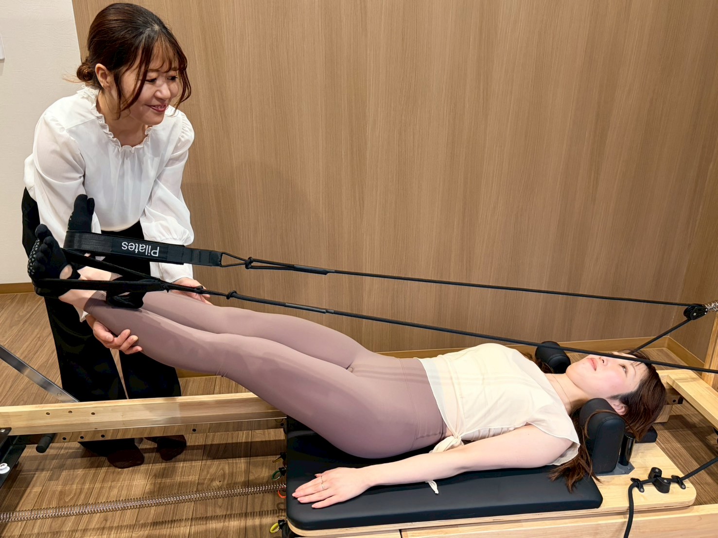 ピラティス専用マシン(リフォーマー)が体を支えるので、超初心者でも最初から正しいフォームで行えます。